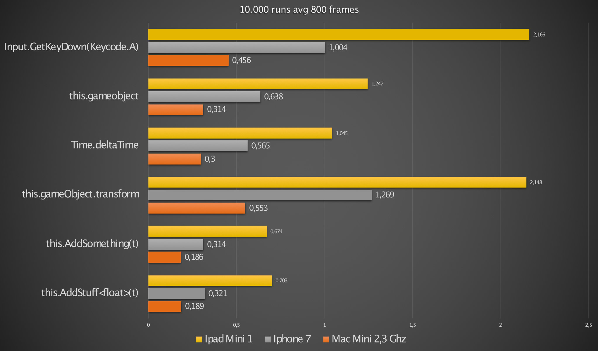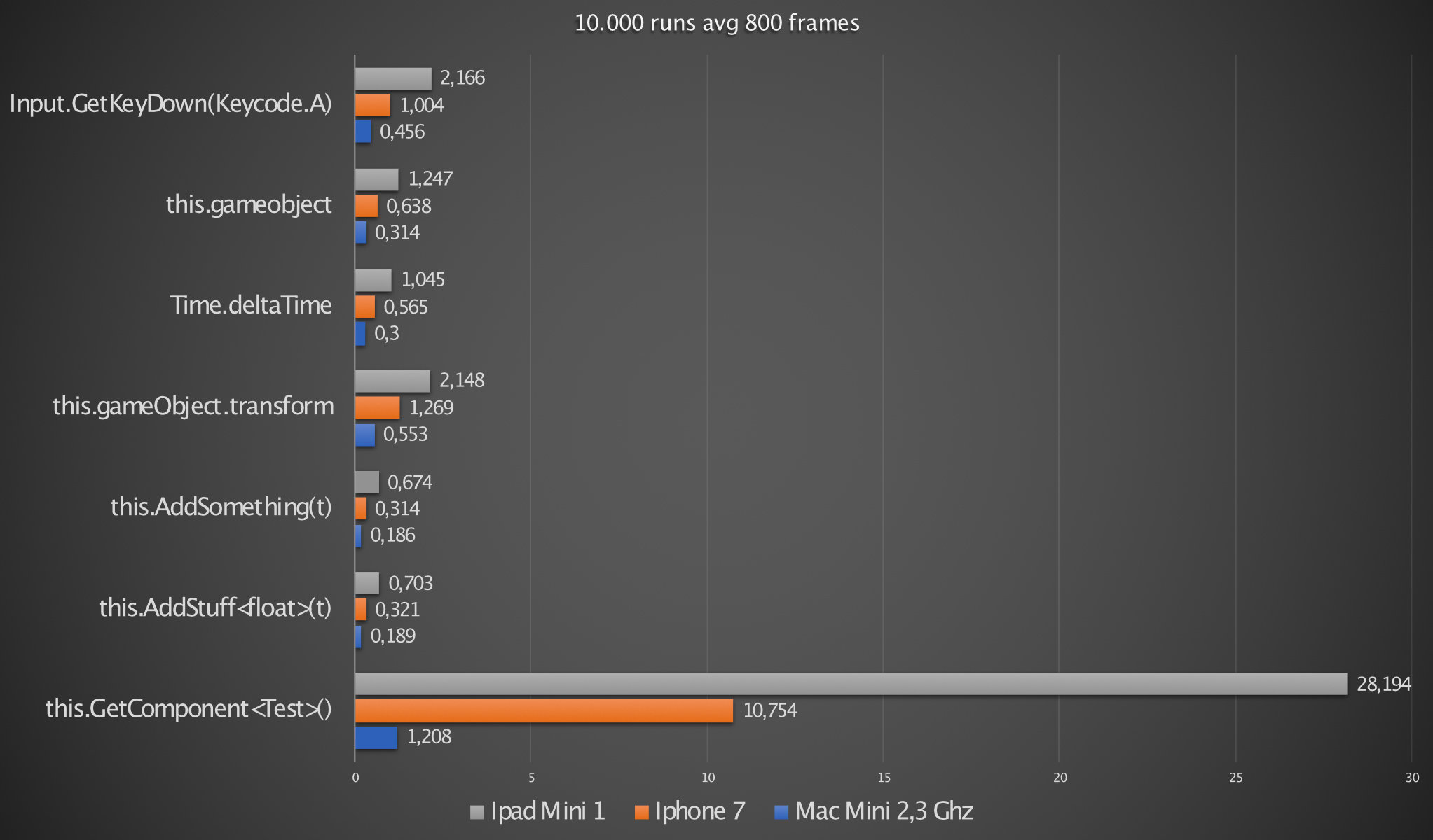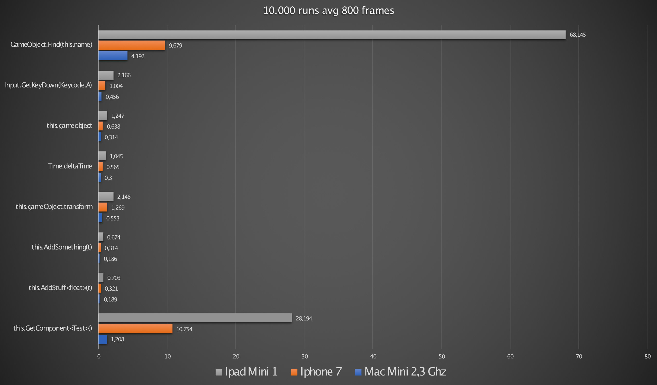 As you can see GameObject.Find() is even worse with an average caculation time on Ipad Mini 1 of 68 ms! That means in one millisecond you can only search about 145 times and thats it! But more importantly: Look at the IPhone 7's results in this.Getcomponent():