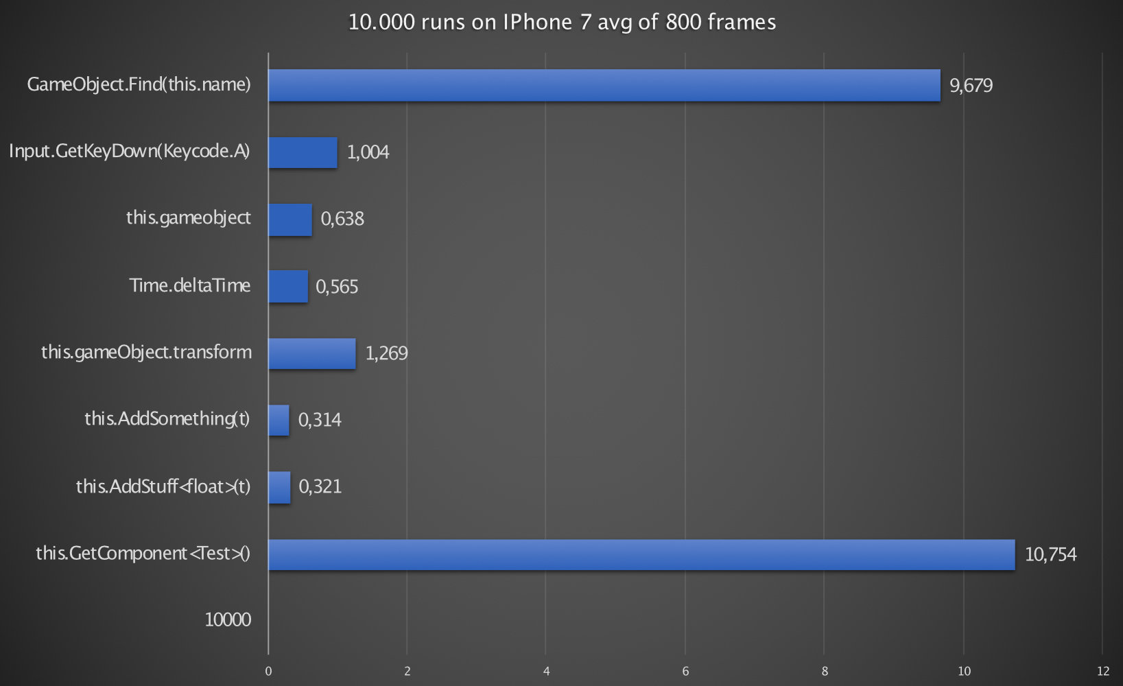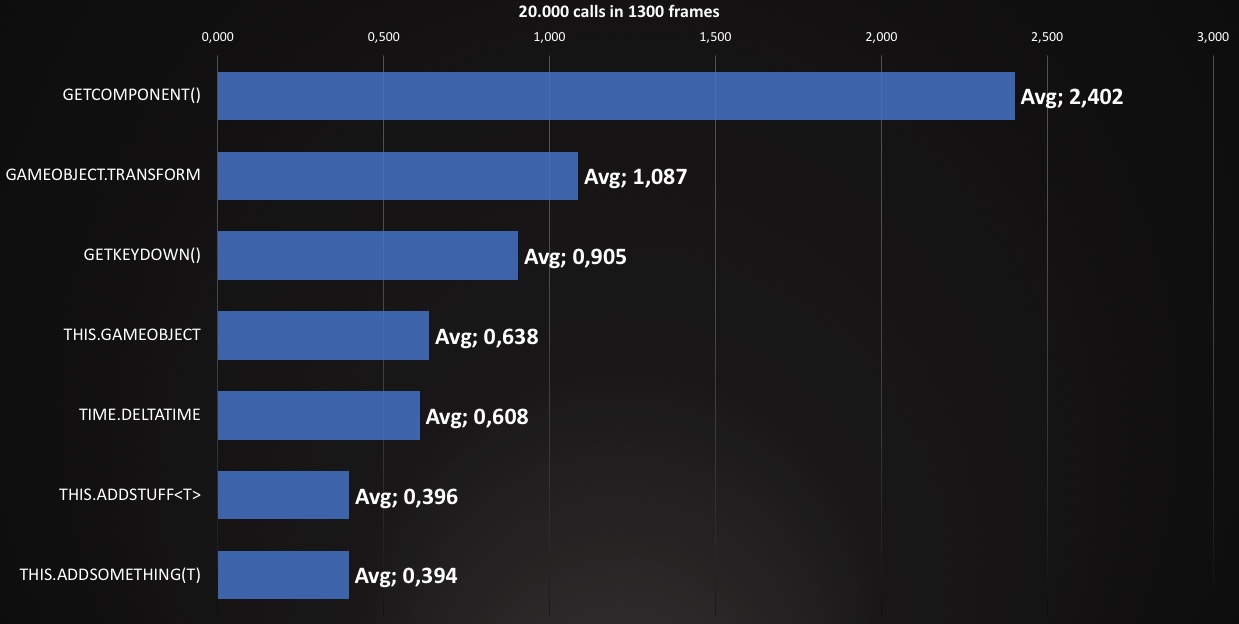 This shows that clearly you should try not to use GetComponent very often. With that said, even if you would call GetComponent 1.000 times, on average, you will loose only about 0,7 ms.